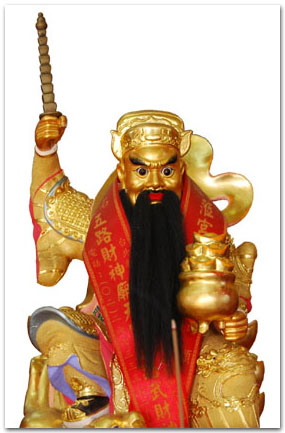 「財神爺」俗稱「趙玄壇」、「寒單爺」。道諱稱為「上清如意金輪院正一玄壇趙元帥」,是道教護法神之一,民間將衪奉為「武財神」。